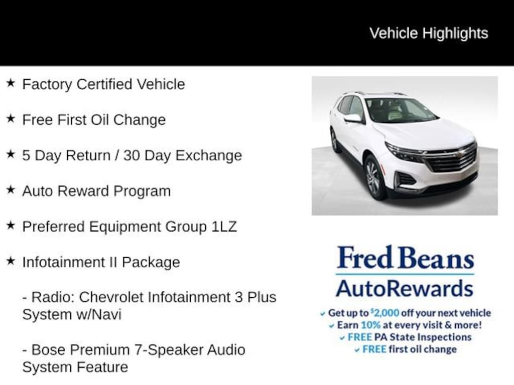 2022 Chevrolet Equinox Premier 1.5L DOHC 6-Speed Automatic Electronic with Overdrive AWD 4D Sport Utility Iridescent Pearl Tricoat Factory Certified Vehicle, Free First Oil Change, 5 Day Return / 30 Day Exchange, Auto Reward Program, AWD, 8-Way Power Front Passenger Seat Adjuster, Bose Premium 7-Speaker Audio System Feature, Driver Convenience II Package, Heated Rear Outboard Seating Positions, Infotainment II Package, Preferred Equipment Group 1LZ, Radio: Chevrolet Infotainment 3 Plus System w/Navi, Ventilated Driver Seat, Ventilated Front Passenger Seat, Wireless Apple CarPlay/Wireless Android Auto.