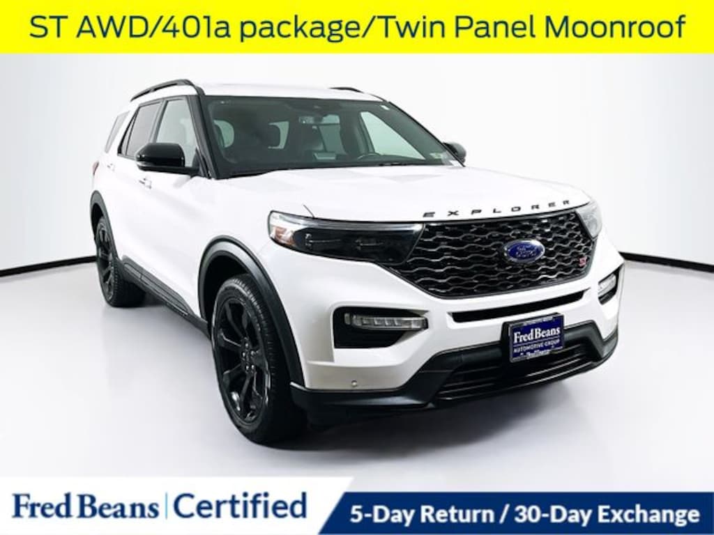 2023 Ford Explorer ST 3.0L EcoBoost V6 10-Speed Automatic 4WD 4D Sport Utility Star White Metallic Tri-Coat Ford Gold Certified, 7 Year / 100k Powertrain Warranty, 12 Month / 12,000 Mile Comprehensive Warranty, 10.1" LCD Capacitive Portrait Touchscreen, 2 Additional Speakers, AM/FM radio: SiriusXM, Automatic temperature control, Equipment Group 401A, Evasive Steering Assist, Exterior Parking Camera Rear, Ford Co-Pilot360 Assist+, Front dual zone A/C, Heated door mirrors, Heated steering wheel, Intelligent Adaptive Cruise Control, Leather Htd/Ventilated Sport Captain's Chairs, Power door mirrors, Power driver seat, Power Liftgate, Power passenger seat, Power windows, Radio: B&O Sound System by Bang & Olufsen, Rear air conditioning, Rear window defroster, Rear window wiper, Remote keyless entry, Speed Sign Recognition, ST High Package, ST Street Pack, SYNC 3 Communications & Entertainment System, SYNC 3/Apple CarPlay/Android Auto, Technology Package, Twin Panel Moonroof, Voice-Activated Touchscreen Navigation System, Wheels: 21" Aluminum.