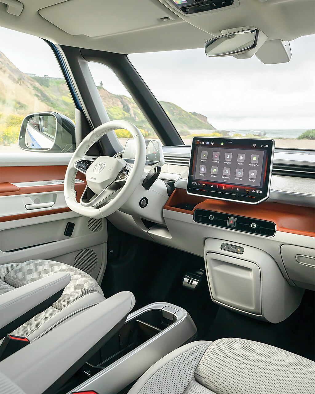 Step inside the 2025 Volkswagen ID. Buzz and discover a spacious, versatile interior that adapts to your needs. With seating for up to seven passengers, the Volkswagen ID. Buzz offers flexible configurations to accommodate family, friends, and all your gear. Enjoy premium amenities like perforated V-Tex leatherette seating surfaces, heated front seats with massage function, and a panoramic fixed glass roof that bathes the cabin in natural light. The interior of the Volkswagen ID. Buzz is designed to provide comfort, convenience, and ample space for all your adventures.