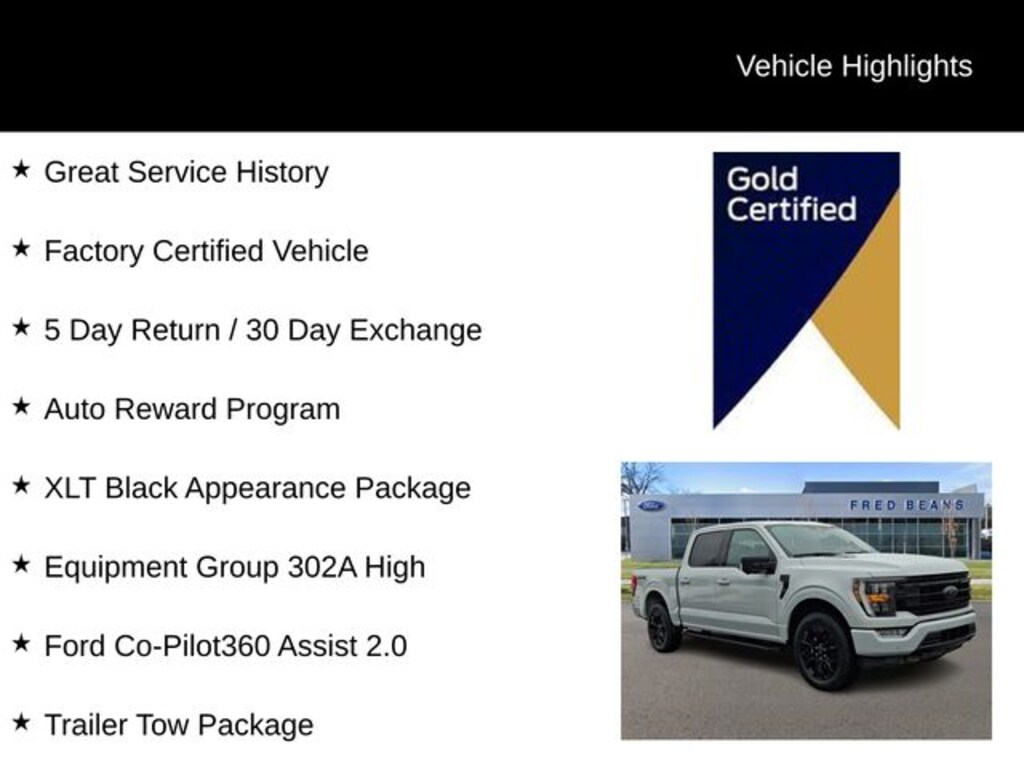 2023 Ford F-150 XLT 2.7L V6 EcoBoost 10-Speed Automatic 4D SuperCrew Avalanche Great Service History, Factory Certified Vehicle, 5 Day Return / 30 Day Exchange, Auto Reward Program, F-150 XLT, 4D SuperCrew, 2.7L V6 EcoBoost, 10-Speed Automatic, 4WD, Avalanche, Black w/Leather-Trimmed Bucket Seats, 10-Way Power Driver & Passenger Seats, 8" Productivity Screen in Instrument Cluster, Accent-Color Step Bars, Black 2-Bar Style Grille w/Black Surround/Accents, Black 6" Angular Step Bars, Black Exterior Badging, Body-Color Door & Tailgate Handles, Body-Color Front & Rear Bumpers, Box Side Decals, Class IV Trailer Hitch Receiver, Connected Built-In Navigation, Dark Interior Appliques, Dual Zone Electronic Automatic Temperature Control, Equipment Group 302A High, Evasive Steering Assist, Ford Co-Pilot360 Assist 2.0, GVWR: 6,600 lbs Payload Package, Heated Front Seats, Integrated Trailer Brake Controller, Intelligent Access w/Push Button Start, Intelligent Adaptive Cruise Control w/Stop & Go, Intersection Assist, LED Reflector Headlamps, LED Sideview Mirror Spotlights, Matte Black Tailgate F-150 Decal, Onboard 400W Outlet, Power Glass Heated Sideview Mirrors, Pro Trailer Backup Assist & Pro Trailer Hitch Assist, Rear Under-Seat Storage, Remote Start System w/Remote Tailgate Release, SYNC 4 w/Enhanced Voice Recognition, Trailer Tow Package, Unique Hood & Grille w/Black Accent, Unique Sport Cloth 40/Console/40 Front-Seats, Wheels: 18" 6-Spoke Machined Aluminum, Wheels: 20" Gloss Black Painted Aluminum, Wrapped Steering Wheel, XLT Black Appearance Package, XLT Sport Appearance Package, Zone Lighting.