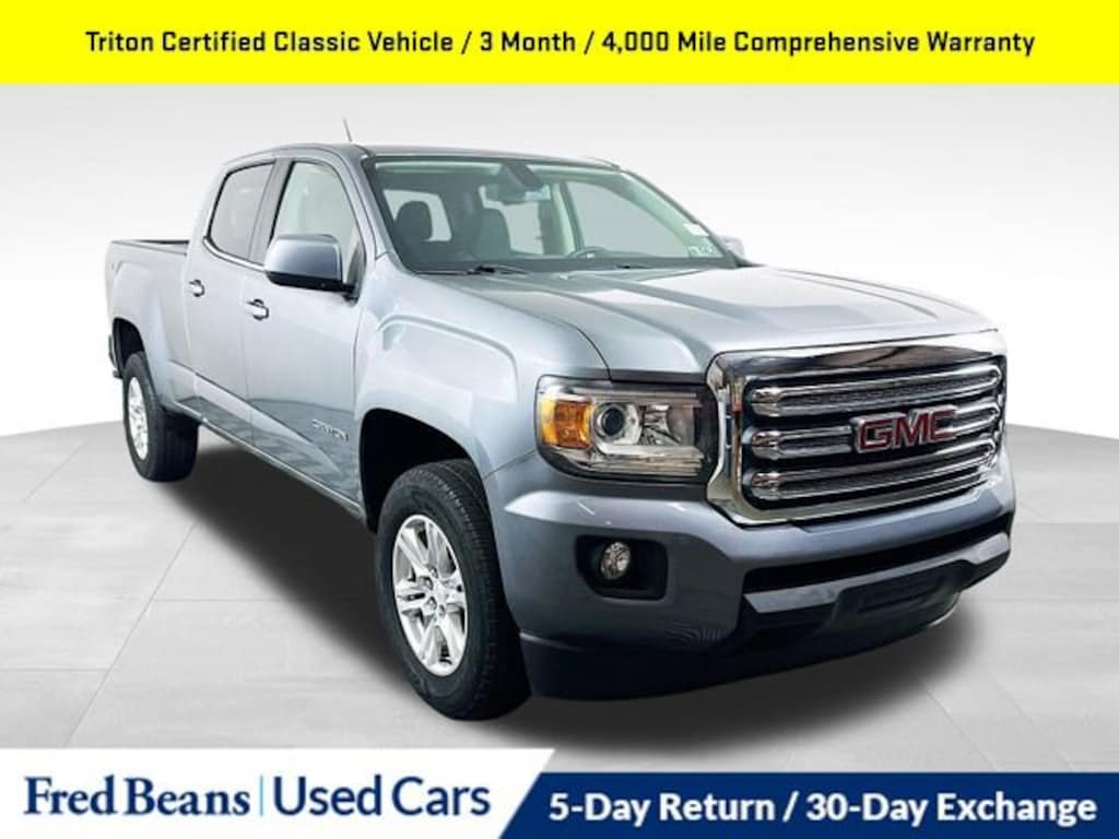Clean CARFAX.2019 GMC Canyon SLE1 V6 8-Speed Automatic 4WD 4D Crew Cab Satin Steel Metallic Triton Certified Classic Vehicle, 3 Month / 4,000 Mile Comprehensive Warranty, Free First Oil Change, 5 Day Return / 30 Day Exchange, Auto Reward Program, 4WD.Odometer is 51010 miles below market average!Certified. Certification Program Details: Triton Certified Shield Classic 3-Month or 4,000-Mile Comprehensive Coverage ($100 deductible) 100+ Multipoint Inspection PA State Inspection & Emissions Test Oil, Lube, & Filter Service Completed 5-Day Return Policy1 30-Day Exchange Policy2 CARFAXTM Report AutoRewards Membership See salesperson for additional offers & complete details.For better peace of mind all our used vehicles have a 127-point inspection and come with a 5-day return, 30-day exchange (As-Is vehicles are excluded). Our exclusive Auto Rewards Program provides better value with Free First Oil change, Free Pa State Safety inspections, discounts for local merchants and more. Plus, you can earn up to $2000 towards your next vehicle just by servicing with Fred Beans! As Fred Beans always says, our used cars are better because our reputation depends on it.Although every reasonable effort has been made to ensure the accuracy of the information contained on this site, absolute accuracy cannot be guaranteed. This site, and all information and materials appearing on it, are presented to the user as is without warranty of any kind, either express or implied. All vehicles are subject to prior sale. Price does not include applicable tax, title, license, processing and/or documentation fees. Vehicles shown at different locations are not currently in our inventory (Not in Stock) but can be made available to you at our location within a reasonable date from the time of your request, not to exceed one week. Residency restrictions may apply.