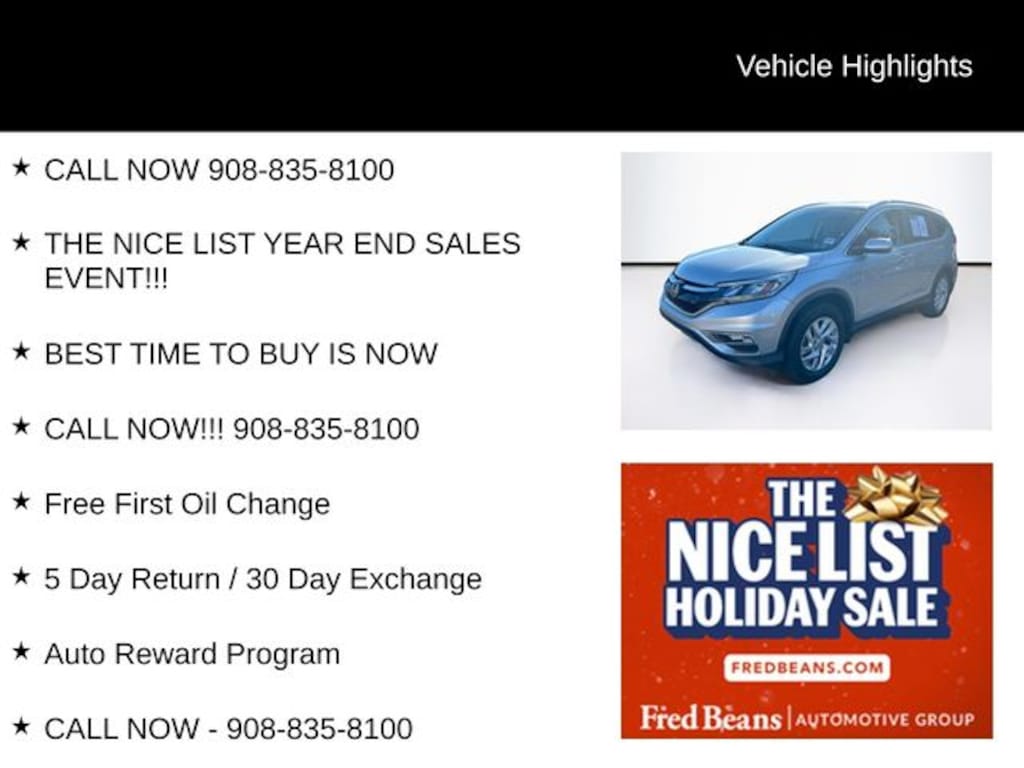CALL NOW 908-835-8100, THE NICE LIST YEAR END SALES EVENT!!!, BEST TIME TO BUY IS NOW, CALL NOW!!! 908-835-8100, Free First Oil Change, 5 Day Return / 30 Day Exchange, Auto Reward Program, CALL NOW - 908-835-8100, SOLD AS-IS, AWD, 4-Wheel Disc Brakes, ABS brakes, Dual front impact airbags, Dual front side impact airbags, Exterior Parking Camera Rear, Front dual zone A/C, Front fog lights, Power moonroof, Radio: AM/FM/CD/SiriusXM Audio System, Security system, Traction control. 2015 Honda CR-V EX-L 2.4L I4 DOHC 16V i-VTEC CVT AWD 4D Sport Utility Alabaster Silver Metallic 26/33 City/Highway MPG