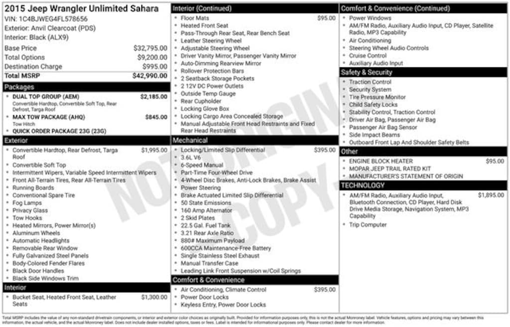 Backed by the renowned Jeep brand, this 2015 Wrangler Unlimited Sahara is a true icon of adventure and capability. Its timeless design, exceptional features, and uncompromising performance make it the perfect companion for your next outdoor excursion. Experience the freedom and versatility of this remarkable Jeep today.